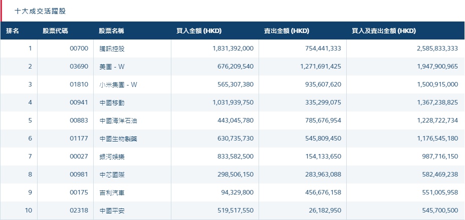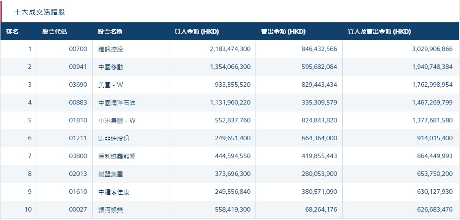 港股通(沪)十大活跃成交股