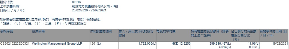 智通财经APP获悉,香港联交所最新资料显示,2月19日,Wellington Management Group LLP减持龙源电力(00916)178.2万股,每股作价12.825港元,总金额约为2285.4万港元。减持后最新持股数目约为3.995亿股,最新持股比例为11.96%。
