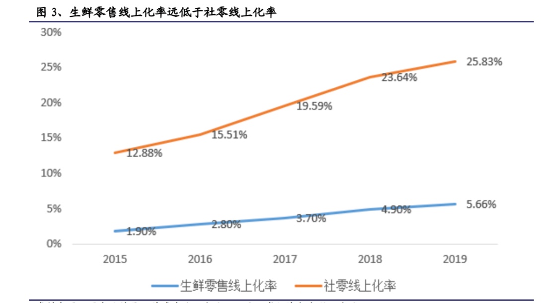 一是,生鲜市场容量大且线上渗透率较低,拥有极大生长空间。