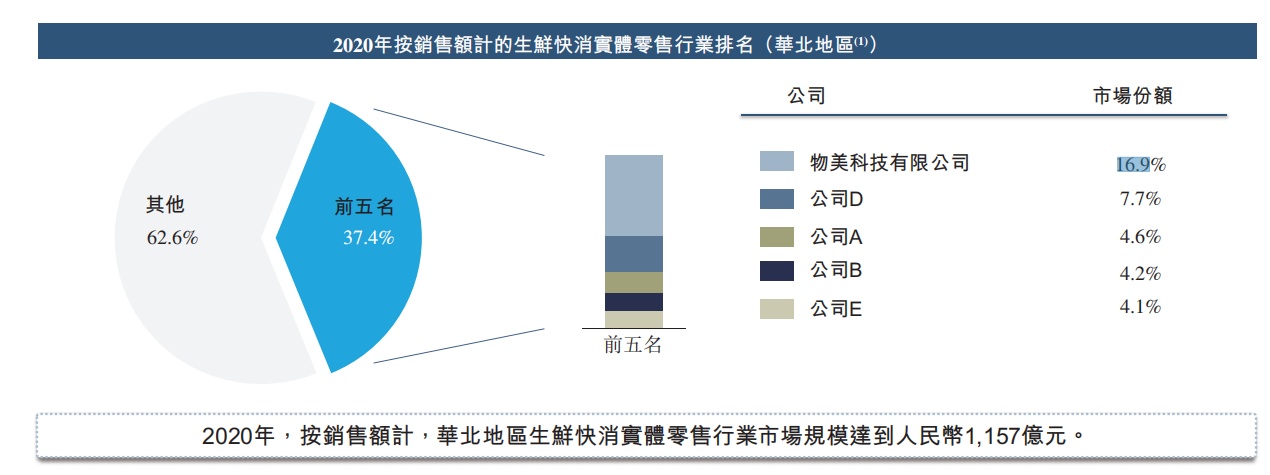 人和方面,物美这几年同样也做出了不少努力:2018年推出“每日鲜蔬菜”,2020年推出了“活鱼净膛每日鲜”,且76%的生鲜食品实现了产地直采。其在招股书中自称,已成为华北地区最大生鲜实体零售企业,2020年市场份额为16.9%。