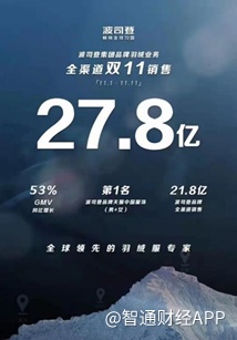“双11”狂欢购物节刚落下帷幕,在刚刚过去的购物节中,国内羽绒服巨头波司登(03998)再次霸榜,全渠道“双11”销售额高达27.8亿元,再创新高。其中,波司登品牌成交额位列天猫平台中国服饰第一,全渠道销售额达21.8亿元,持续领跑中国服装品牌,夯实全球领先地位。