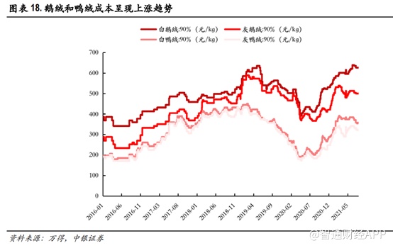 由于环保督察趋严,鹅绒连年减产,并且疫情影响下市场大环境不确定因素增长,整体原材料行情不稳定,鹅绒、鸭绒价格均有不同程度的上涨。以90%含绒量的鹅绒鸭绒为例,2016年以来,鹅绒单价持续上涨,目前90%含量白鹅绒626.4元/kg,涨幅为14.1%,另外90%含量灰鹅绒、鸭绒、90%含量白鸭绒以及灰鸭绒均有不同程度的涨价。