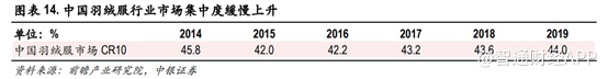 不仅如此,目前国内的羽绒服市场集中度仍旧比较低。根据前瞻产业研究院报告显示,2014 年CR10较高,为 45.8%,2015年集中度降低明显,此后缓步上升,2019 年 CR10 达到44%。随着消费升级,消费者对羽绒服的认知不再是御寒保暖工具,而是兼具功能性与时尚性的单品,这对产品设计提出了更高的要求,推动企业进行创新研发和产品品质提升,有利于竞争格局的优化,行业集中度将更加倾向于优质企业,规模较大的企业将进一步占领行业资源,中银证券预计未来CR10将继续稳步提升。