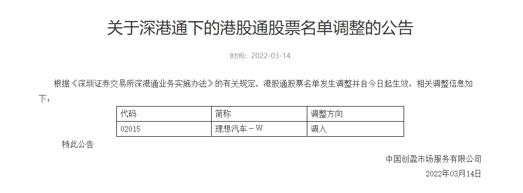 智通财经APP获悉,3月14日,深交所公告,将理想汽车-W(02015)调入深港通下的港股通股票名单,今日起生效。