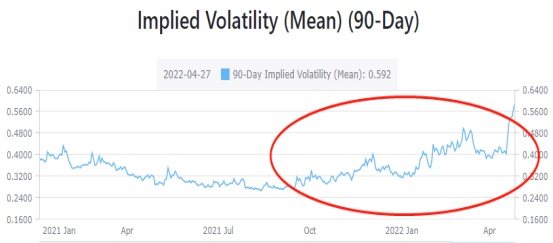 虽然Q1部分业绩数据的“转晴”为该股股价带来了提振,在财报公布后,该股在盘后行情中走高。但从期权所推算出的隐含波动率来看,该股未来的走势很有可能依然会处于高波动状态。