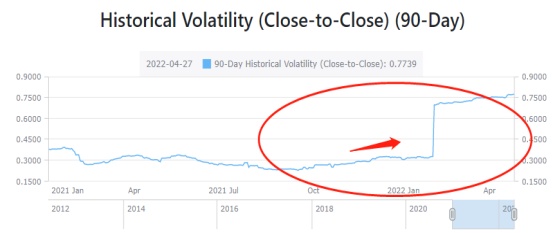 而从过去90天的历史波动率来看,如下图所示,从2021年下半年开始,该股的历史波动率也是在缓慢不断上升的,这也反映出股价的最终走势和市场预期在一定程度上是相拟合的。当然,我们还需考虑到“极端”事件的影响。在2022年2月时,由于当时Meta在Q4财报上的业绩指引上“爆雷”,导致股价大幅下跌,所以引起历史波动率的快速升高。因此,除非之后每次的季度财报都出现“爆雷”情况,否则该股所展现出的波动率应该不至于历史图表所展示的那么高。