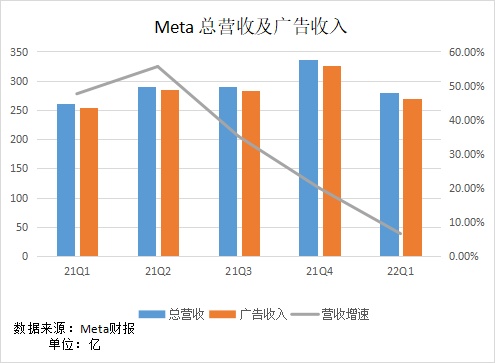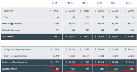 在去年,由于受到苹果变更隐私政策的影响,Meta的季度广告业务收入增长出现下滑趋势。 而广告业务收入作为Meta目前主要的收入来源,其表现的不如意自然也会影响Meta的整体业绩。管理层曾预计2022年第一季度营收增速仅为3%至11%。
