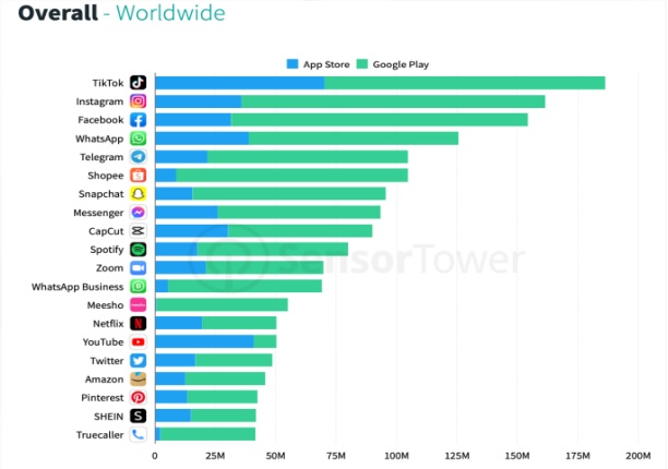 而Meta旗下的Instagram、Facebook以及WhatsAPP则分别位列榜单中的第二、第三及第四位。根据统计,Instagram已成为目前Meta旗下的“头牌”--下载量连续3季排名Meta旗下应用第一,但要需注意到,在一季度中,Instagram下载量环比下跌7%,跌至1.63亿次。而Facebook和WhatsAPP则分别约为1.55亿和1.25亿次。