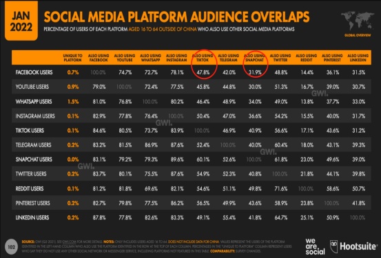 此外,Hootsuite的一份“overlap”榜单(下图,既使用Facebook也使用某其它社媒平台的用户)显示Snapchat和TikTok用户与Facebook用户的“重复率”分别为47.8%和31.9%。可以说这一数值并不高(低于50%),因此,相对于Youtube(74.7%),以及Meta自己旗下的WhatsApp及Instagram来说,Snapchat与TikTok的强势崛起对Facebook来说是更具威胁。它们的崛起就意味着Facebook的社交媒体市场份额正慢慢被不同的对手蚕食。