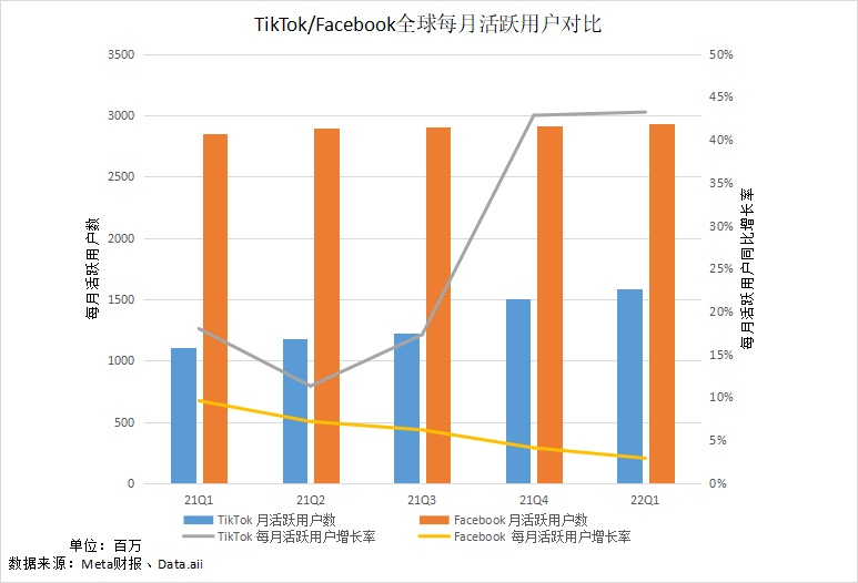 反观Facebook,2022年第一季度的每日全球活跃用户数为19.60亿,与去年同期相比,增长幅度仅为4.37%,虽然成功逆转去年第四季度的环比下降情况,但同比增速依然处于低位收窄状态。