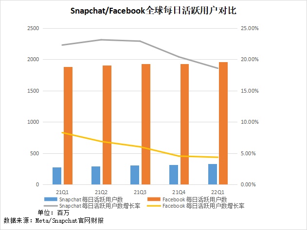 在社媒行业上,Facebook就面临着来自Snapchat的挑战。后者在2022年第一季度的全球每日活跃用户(DAU)数达到3.32亿,与去年同期相比,增长幅度达18%。虽然其同比增速与Facebook一样处于下降状态,但依然维持在中等水平的双位数增长。