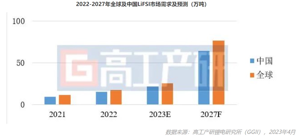 据GGII数据显示,2022年全球LiFSI需求量超1.2万吨,中国LiFSI需求量超1.1万吨,同比增长超60%,预计到2027年中国LiFSI需求量有望超7万吨,2022年-2027年CAGR超45%。