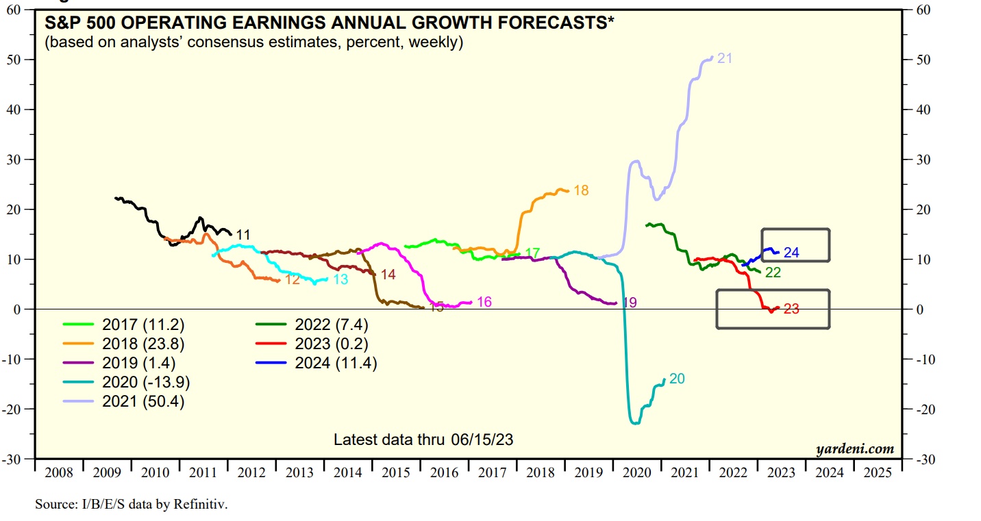 根据分析师的普遍预测水平,第一季度可能标志着企业盈利水平的阶段性低谷。分析师们普遍预计,从2022年底开始的利润收缩趋势预计将在今年第三季度左右结束,并预期在2024年恢复两位数级别的利润大幅增长趋势。市场往往提前半年左右的时间定价趋势线,但是,一些美股市场的"看涨信仰者们”可能已开始为极度乐观的利润趋势做准备工作。