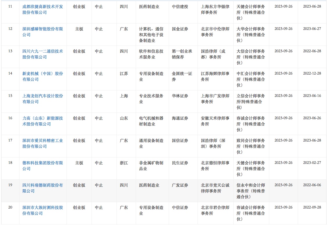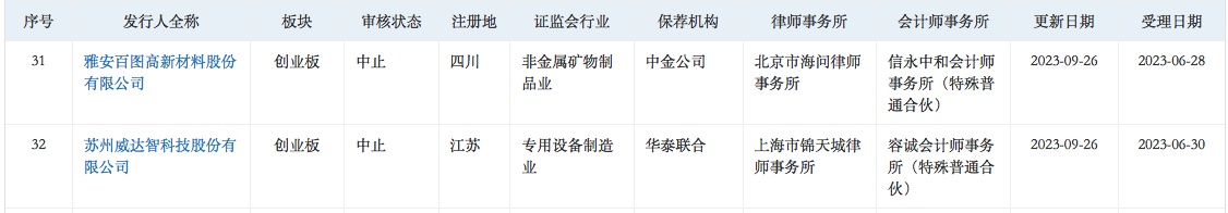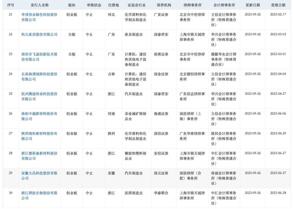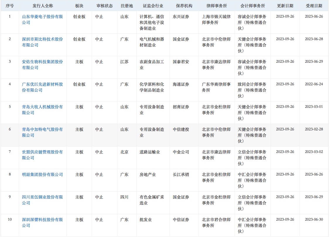 智通财经APP获悉,9月26日,华菱电子、斯比特、安佑生物、优巨新材、中加特、大牧人、世盟股份、明喆集团、里伍铜业、深蕾科技、欣捷高新、感臻智能、六九一二、新麦机械、龙创设计、力高新能、爱贝科、德和科技、科瑞德、大族封测、华茂伟业、科凡家居、飞速创新、海谱润斯、腾励传动、中超股份、陕西瑞科、德斯泰、大昌科技、湃肽生物、百图股份、威达智共32家企业申请深交所IPO审核状态变更为“中止”。