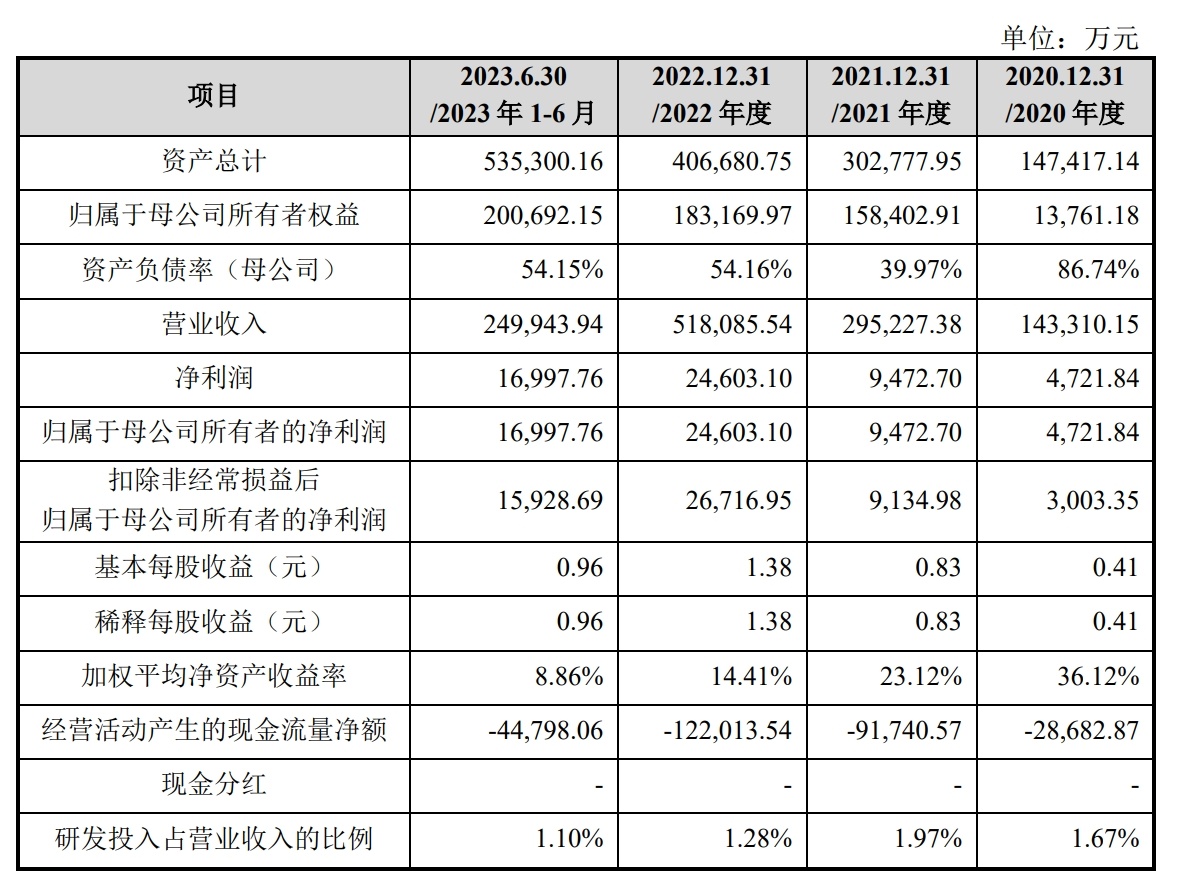 财务方面,于2020年、2021年、2022年及2023年上半年,永臻股份实现营业收入分别约为14.33亿元、29.52亿元、51.81亿元及24.99亿元。同期,该公司实现净利润分别约为4721.84万元、9472.70万元、2.46亿元及1.70亿元。
