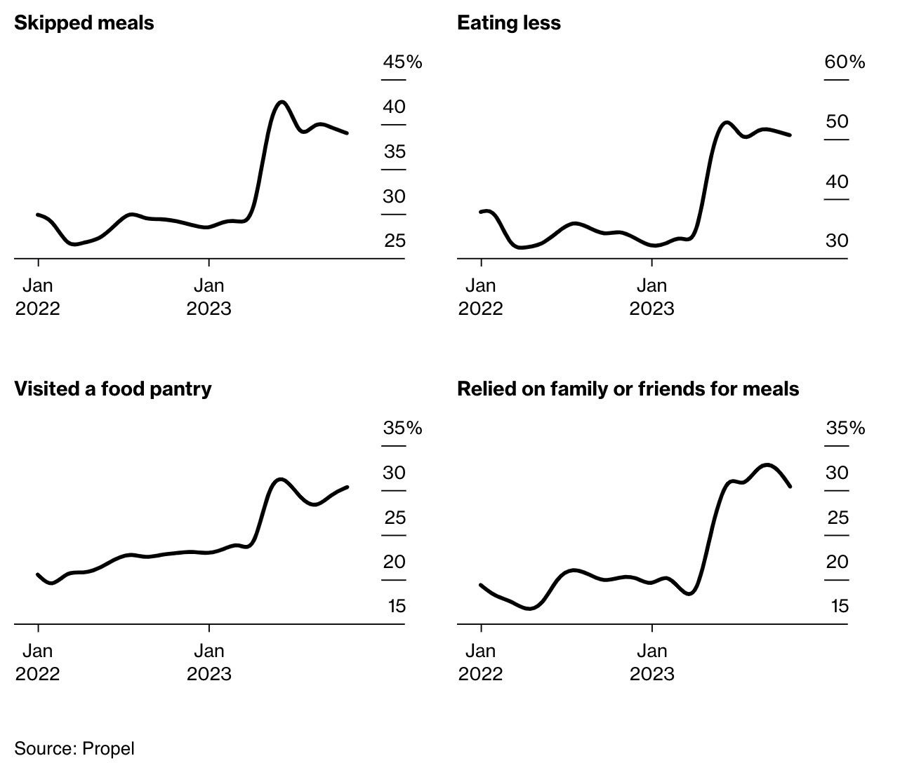 根据参与管理这些福利的Propel Inc报告显示,接受政府补充营养援助计划(SNAP)的家庭中,有一半的人饮食减少,超过30%的人求助于食品救济站,还有30%的人依赖亲友提供餐饮和食品。该调查于9月1日至9月14日对2584名用户进行。受访者通常来自收入处于或低于贫困线的家庭。