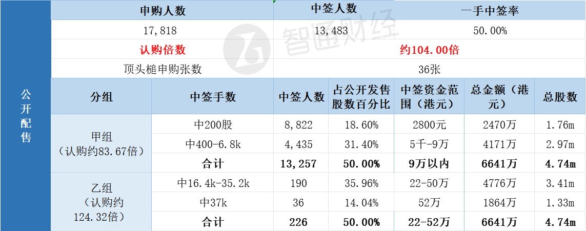 其中,公开配售申购人数17818人,一手中签率50%,认购倍数约104倍。