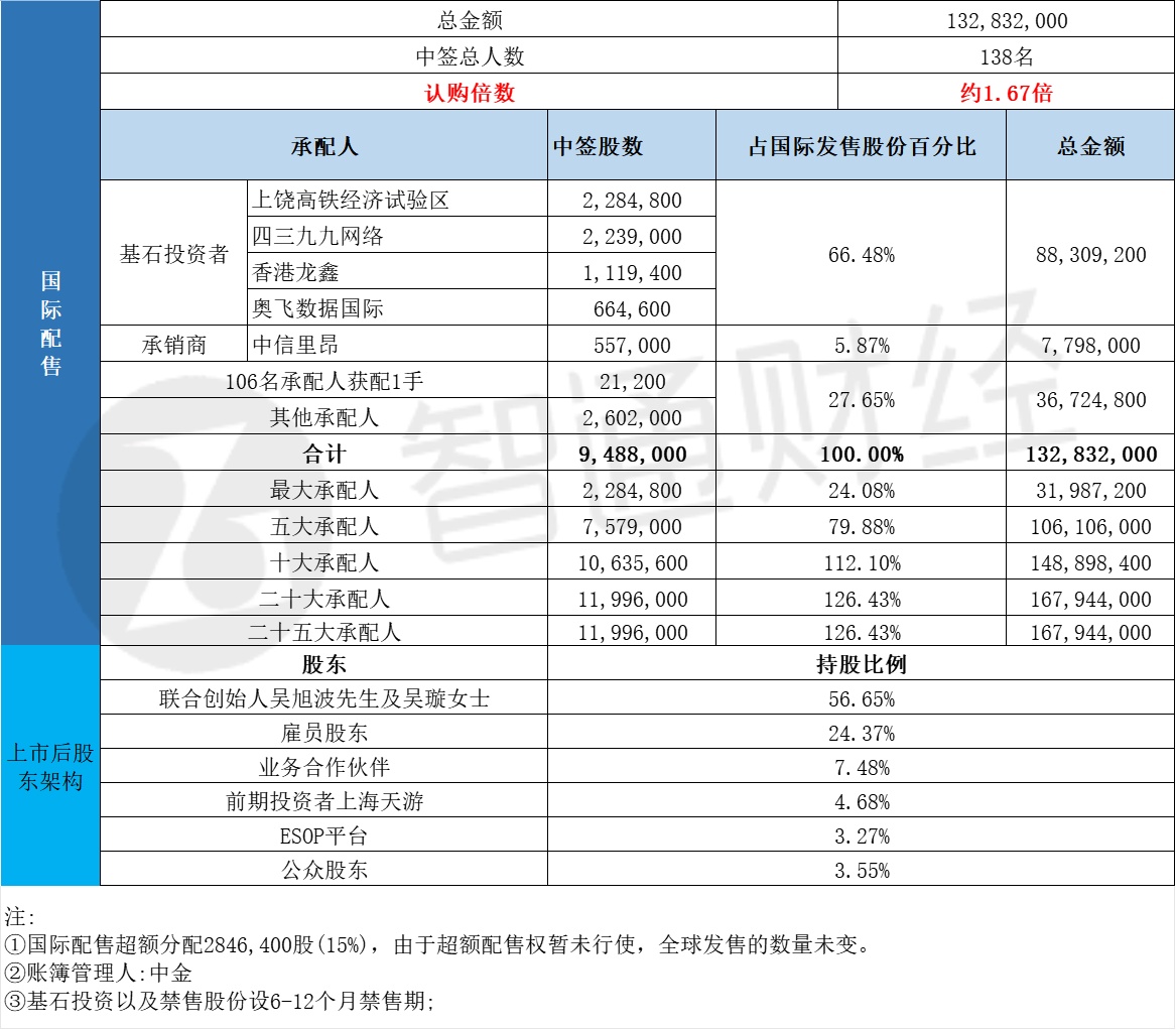 国际配售申购人数未披露,认购倍数约1.67倍。