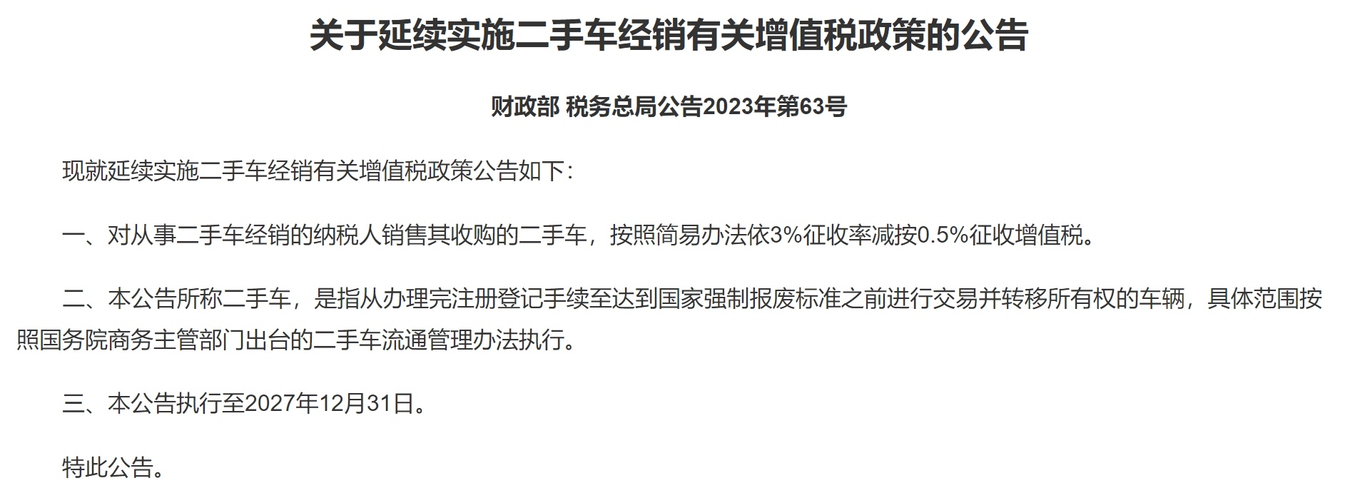 智通财经APP获悉,9月27日,财政部、税务总局发布《关于延续实施二手车经销有关增值税政策的公告》。其中提出,对从事二手车经销的纳税人销售其收购的二手车,按照简易办法依3%征收率减按0.5%征收增值税。公告执行至2027年12月31日。