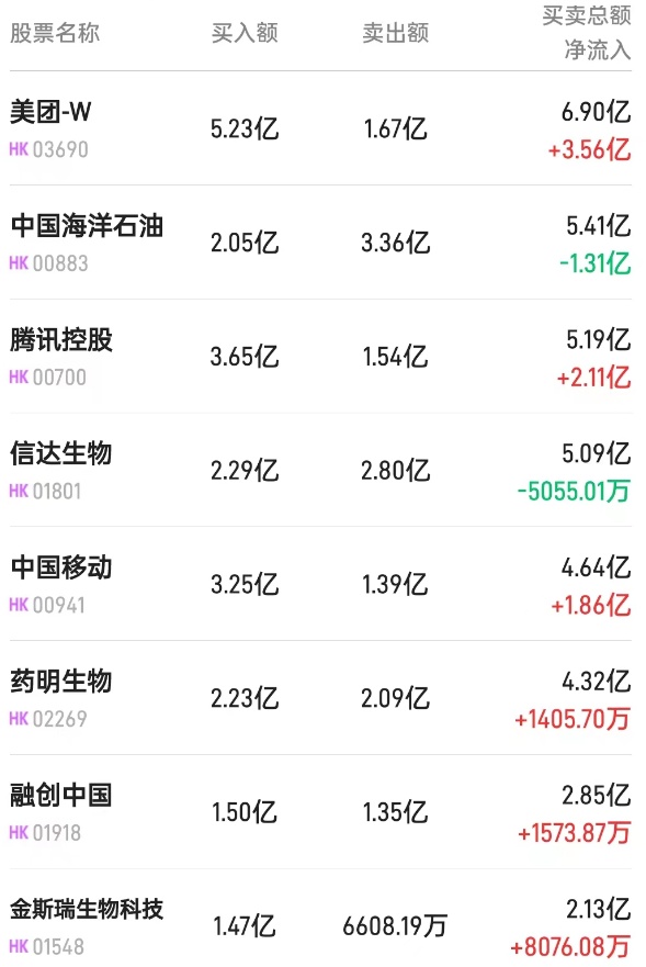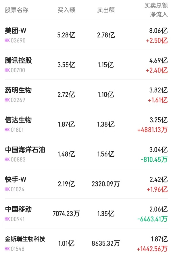 腾讯(00700)获净买入4.5亿港元。消息面上,阿里妈妈和腾讯广告官宣合作,将实现淘宝和微信广告流量的全面直连,推出“双11超引爆”计划。光大证券发布研究报告称,对于腾讯,流量打通可以显著地带来淘系在微信体内购入广告收入的提升,且有望在中长期帮助视频号电商引入更多商家,扩张GMV规模并提升腾讯企业服务收入。