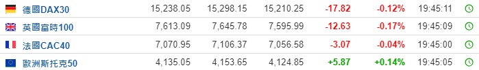 2. 截至发稿,德国DAX指数跌0.12%,英国富时100指数跌0.17%,法国CAC40指数跌0.04%,欧洲斯托克50指数涨0.14%。