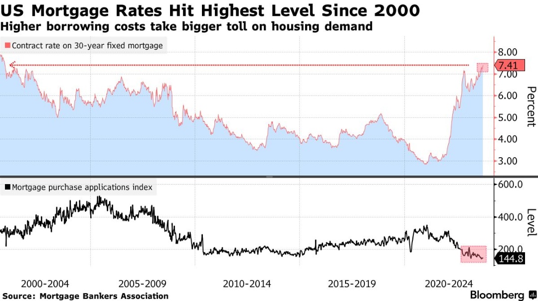 智通财经APP获悉,美国抵押贷款利率上周跃升至2000年以来的最高水平,令本已低迷的购房抵押贷款申请雪上加霜。据美国抵押贷款银行家协会(MBA))周三公布的数据显示,截至9月22日当周,30年期定息抵押贷款的合约利率上升10个基点至7.41%,从而导致购房抵押贷款申请指数跌至144.8,为数十年来的最低水平之一。