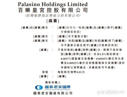 智通财经APP获悉,据港交所9月27日披露,百乐皇宫控股有限公司(以下简称:百乐皇宫)向港交所主板递交上市申请,国泰君安国际为独家保荐人。