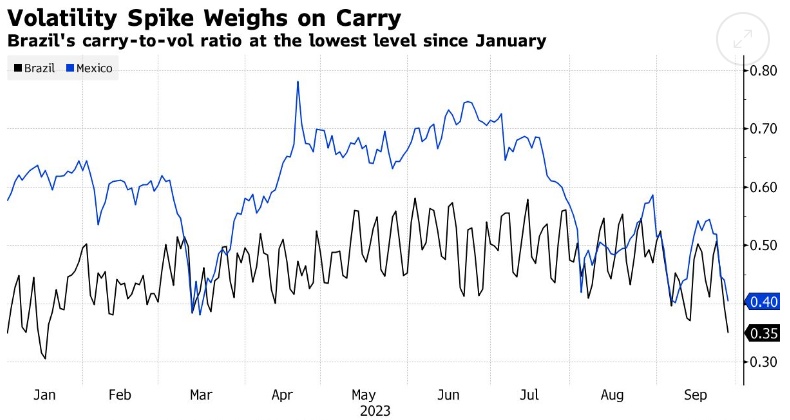 近期全球波动加剧也降低了外汇对套利交易者的吸引力,因为投资这些资产的风险上升,而没有得到更高回报的完全补偿。巴西雷亚尔目前的套利与波动比为1月以来最低,而被广泛视为套利之王的墨西哥比索的吸引力也明显下降。