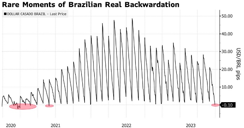 过去几天里,雷亚尔面临的资金外流如此严重,以至于将所谓的“卡萨多”(casado)推至负值区域。卡萨多是指雷亚尔现汇与在当地交易所谈判达成的最短期货合约之间的价差。这使得市场处于投资者所谓的“现货溢价”状态,即现货价格高于期货价格,尽管巴西的利率高于美国。这是一种罕见的现象,只有在现货美元需求加剧时才会发生。