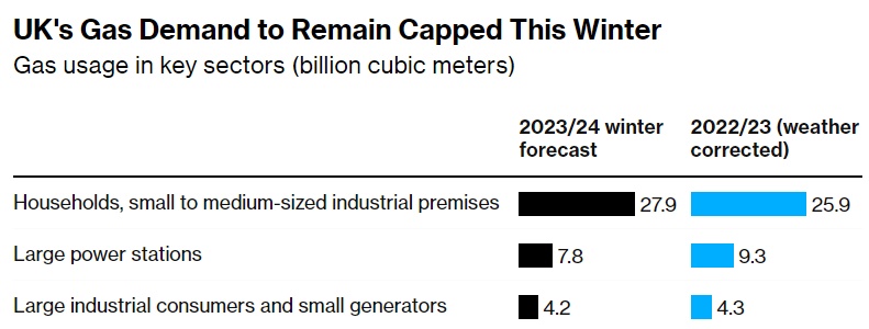 根据英国国家天然气传输公司(National Gas Transmission Plc)的另一份展望,今年冬天的天然气需求预计将接近去年的水平。在价格下跌的刺激下,家庭和企业的天然气消费量可能会上升,但这将被电力部门需求疲软所抵消。