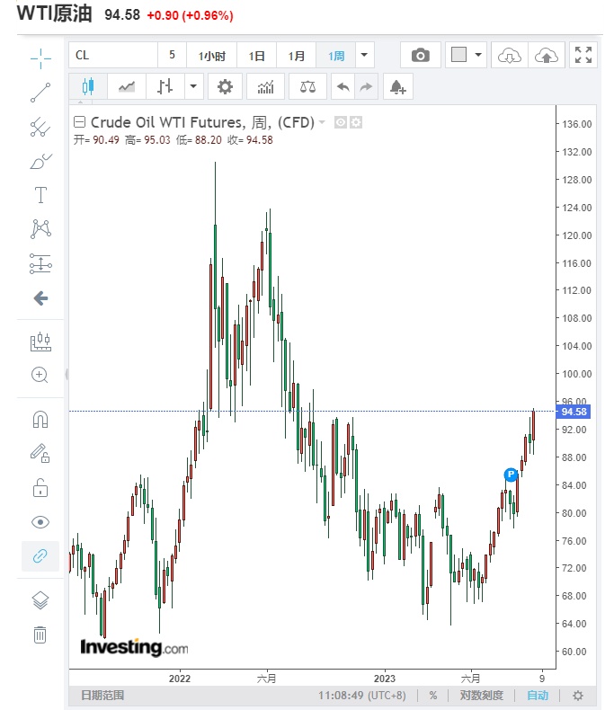 智通财经APP获悉,9月27日,美国WTI原油期货主力合约大涨3.6%,今日继续冲高,现报94.72美元/桶,创一年多以来最高。消息面上,美国能源信息署(EIA)昨日公布的数据显示,美国最大的原油储存中心的原油库存降至2022年7月以来的最低水平,这推动油价短线冲高。