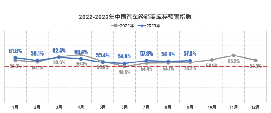 Index)显示,9月中国汽车经销商库存预警指数为57.8%,同比上升2.6个百分点,环比上升0.9个百分点,库存预警指数位于荣枯线之上,汽车流通行业处在不景气区间。