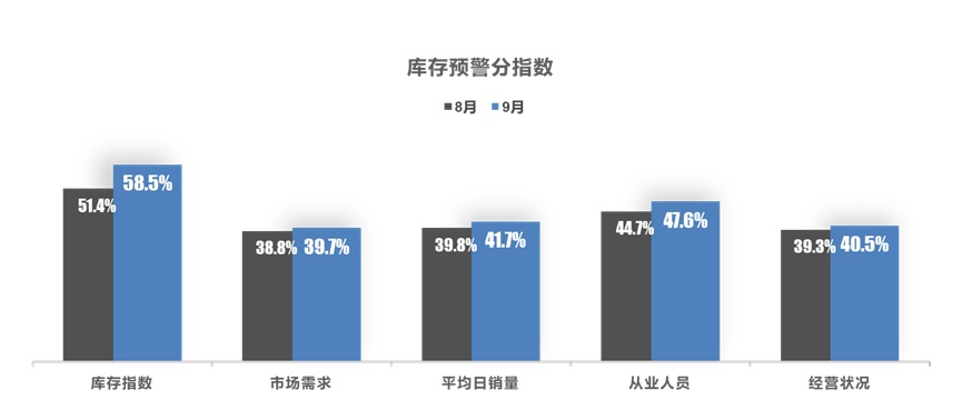 从分指数情况看:9月库存、市场需求、平均日销量、从业人员、经营状况指数环比上升。