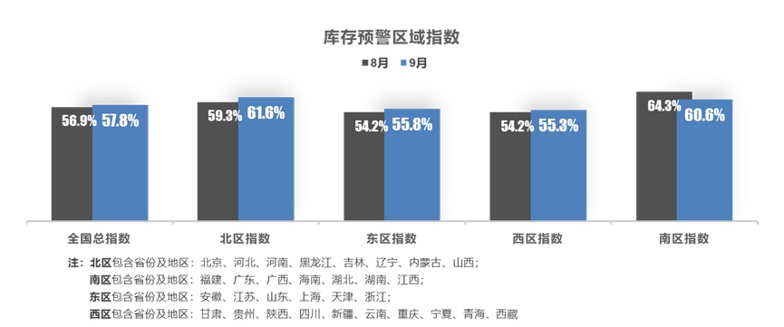 从区域指数情况看:9月全国总指数为57.8%,北区指数为61.6%,东区指数为55.8%,西区指数为55.3%,南区指数为60.6%。