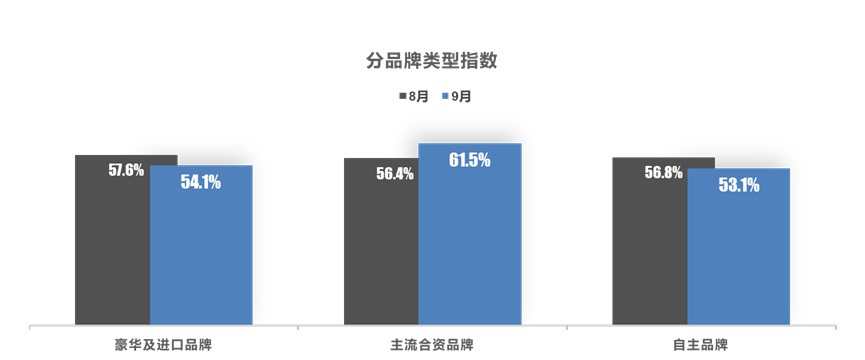从分品牌类型指数看:9月进口及豪华、 自主品牌指数环比下降、合资品牌指数环比上升。