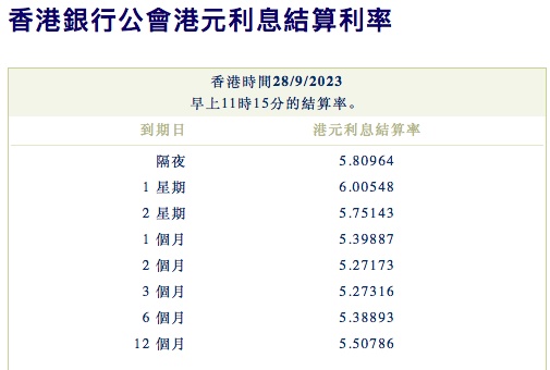 智通财经APP获悉,9月28日,季结前夕,加上香港政府发行最多200亿港元绿色债券将于今日下午2时截止,港元一个月及以下拆息全线上扬,其中,隔夜息反弹至5.80964%,再创2006年有纪录以来最高。一周拆息高见6%近16年新高,而与楼按相关的一个月拆息亦回升至5.39887%,为8月2日以来最高。