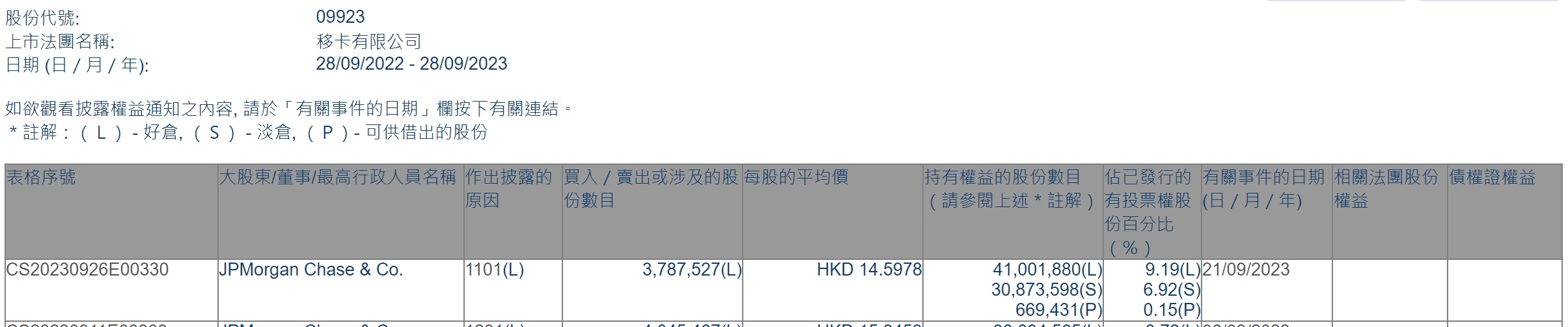 智通财经APP获悉,香港联交所最新资料显示,9月21日,小摩增持移卡(09923)378.7527万股,每股作价14.5978港元,总金额约为5528.96万港元。增持后最新持股数目约为4100.19万股,最新持股比例为9.19%。