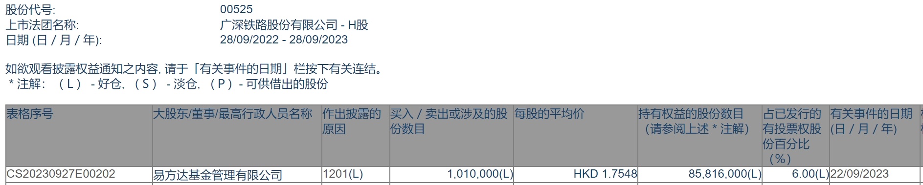 智通财经APP获悉,香港联交所最新资料显示,9月22日,易方达减持广深铁路股份(00525)101万股,每股作价1.7548港元,总金额约为177.23万港元。减持后最新持股数目为8581.6万股,最新持股比例为6.00%。