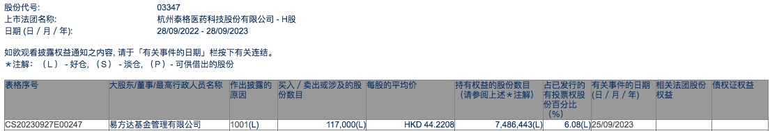 智通财经APP获悉,香港联交所最新资料显示,9月25日,易方达基金管理有限公司增持泰格医药(03347)11.7万股,每股作价44.2208港元,总金额约为517.38万港元。增持后最新持股数目约为748.64万股,最新持股比例为6.08%。