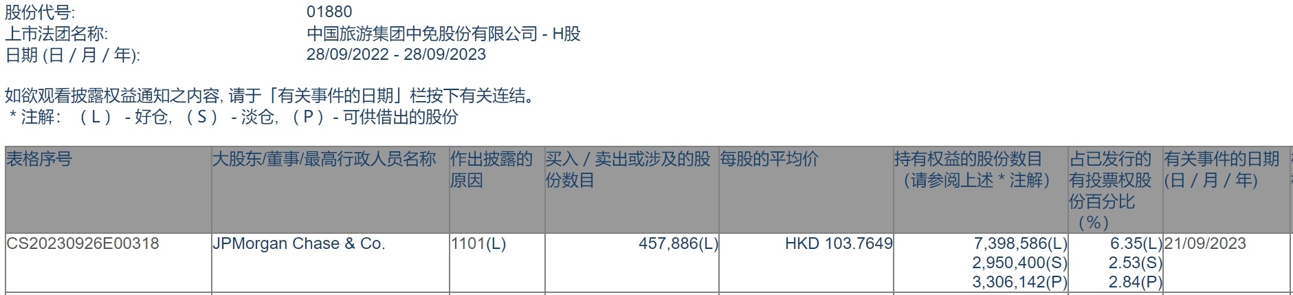 智通财经APP获悉,香港联交所最新资料显示,9月21日,小摩增持中国中免(01880)45.7886万股,每股作价103.7649港元,总金额约为4751.25万港元。增持后最新持股数目约为739.86万股,最新持股比例为6.35%。