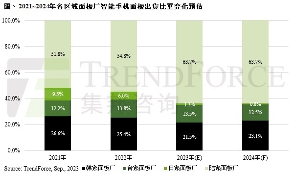 若以各区域面板厂出货比重来看,台系面板厂有a-Si LCD的支撑得以维持比重;日系面板厂大幅度快速退出手机市场,导致比重下滑;韩系面板厂仍凭借柔性AMOLED面板技术与在高端手机的使用下可维持在23~25%;陆系面板厂占整体智能手机面板出货的比重从2022年的54.8%,迅速提升至2023年的63.7%,显示陆系面板厂在整体智能手机供应链中持续关键角色。