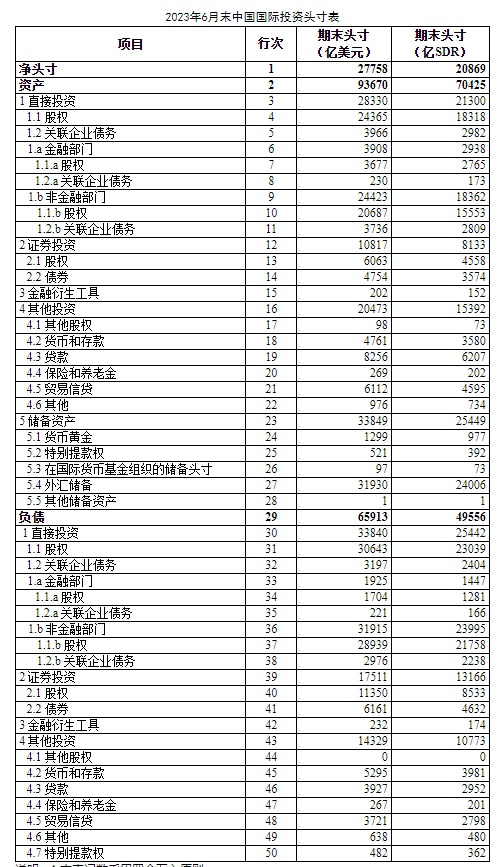 国家外汇管理局公布2023年6月末我国国际投资头寸表