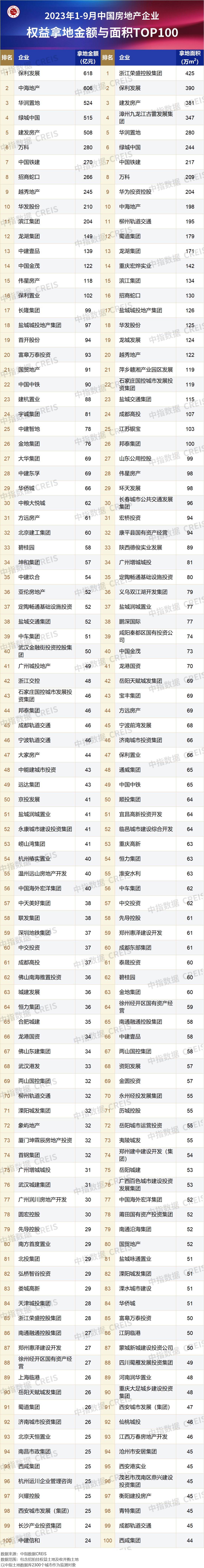 2023年1-9月,TOP100企业拿地总额8599亿元,拿地规模同比下降17.9%,降幅较上月扩大7.4个百分点。TOP100门槛值为24亿元,较上年同期下降7亿元。TOP100企业招拍挂权益拿地总额占全国300城土地出让金的比例为52.7%。