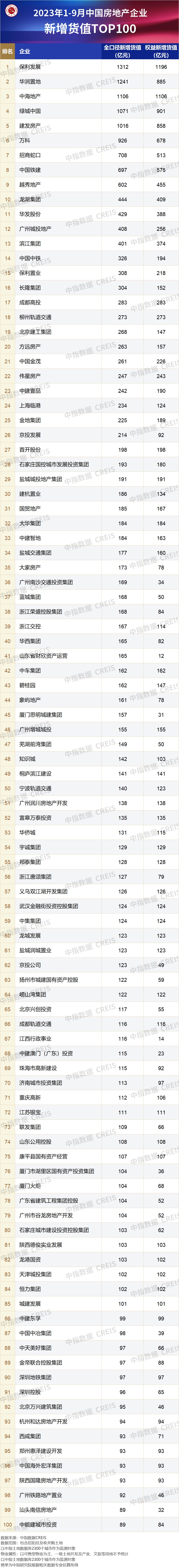 从新增货值来看,保利发展、华润置地、中海地产占据榜单前三位。2023年1-9月,保利发展以累计新增货值1312亿元占据榜单第一;华润置地、中海地产紧随其后,累计新增货值规模分别为1241亿元和1106亿元。TOP10企业2023年1-9月新增货值总额9124亿元,占TOP100企业的39.1%;TOP100企业新增货值门槛为89亿元。