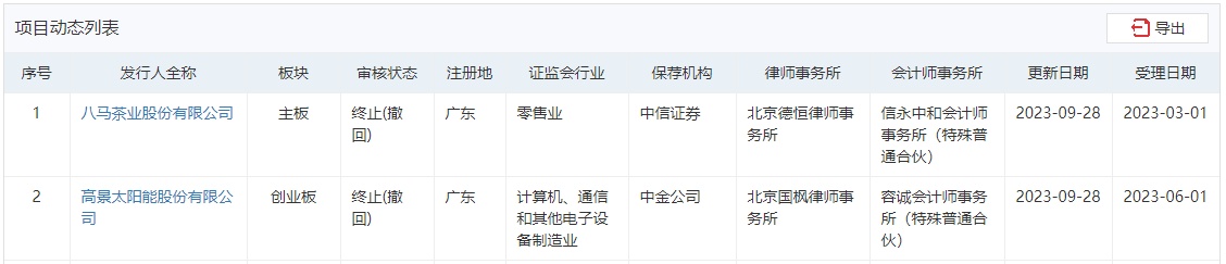 智通财经APP获悉,9月28日,八马茶业股份有限公司(八马茶业)、高景太阳能股份有限公司(高景太阳能)深交所IPO审核状态变更为“终止(撤回)”。