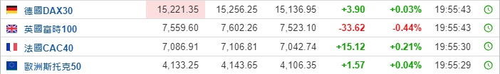 2. 截至发稿,德国DAX指数涨0.03%,英国富时100指数跌0.44%,法国CAC40指数涨0.21%,欧洲斯托克50指数涨0.04%。