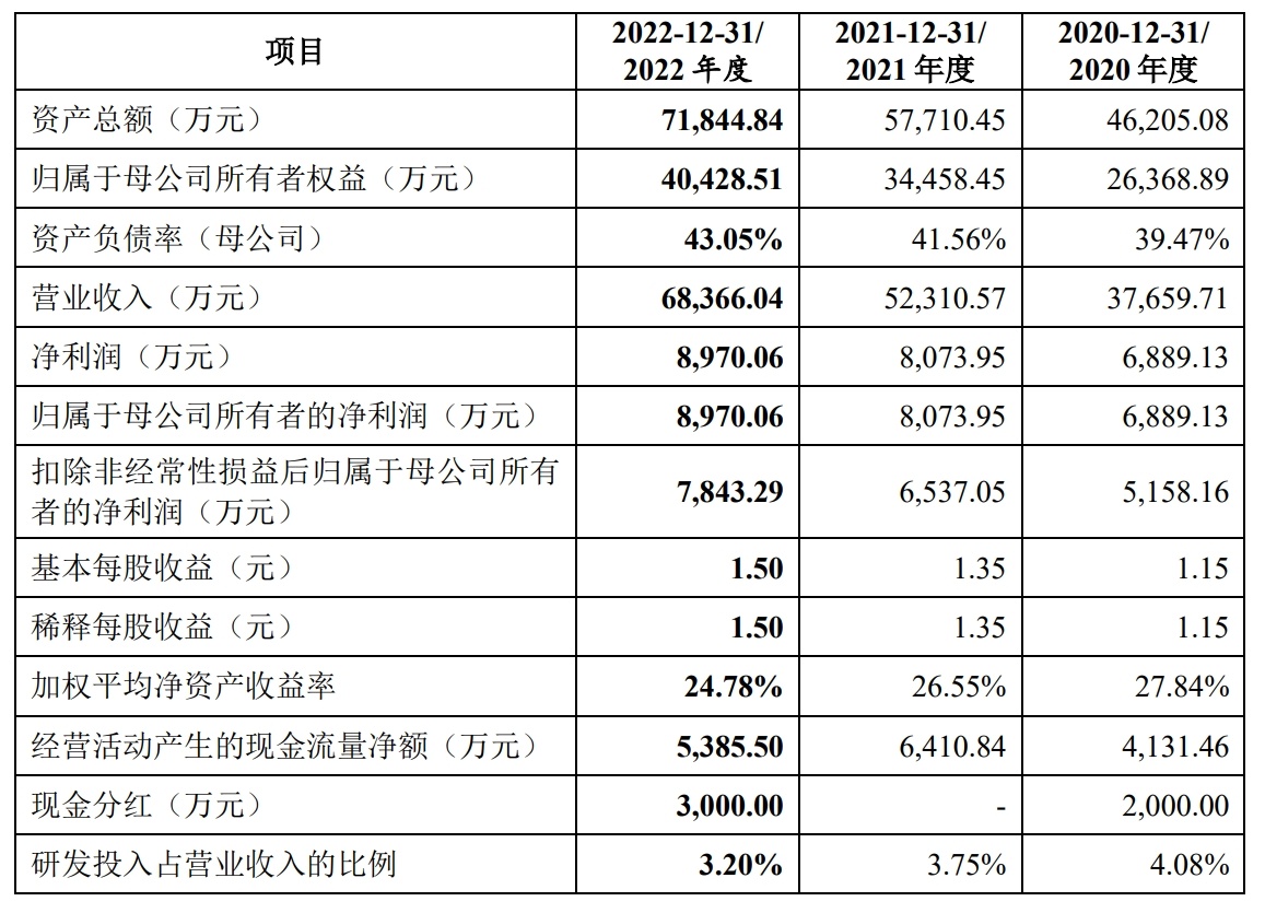 财务方面,于2020年、2021年、2022年度,金标股份实现营业收入分别约为3.77亿元、5.23亿元、6.84亿元。同期,该公司实现净利润分别约为6889.13万元、8073.95万元、8970.06万元。