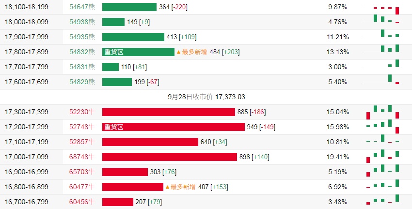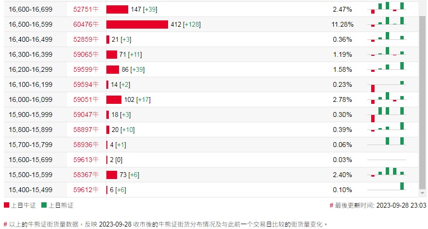 牛证街货重货区在17200-17299区间,该区间最新熊证数量为949张,较上一交易日减少149张。最多新增在16800-16899区间,该区间最新熊证数量为407张,较上一交易日增加153张。