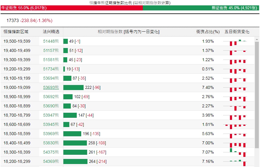 法兴恒指牛熊证街货分布图中的数据显示,熊证街货重货区和最多新增都在17800-17899区间,该区间最新熊证数量为484张,较上一交易日增加203张。