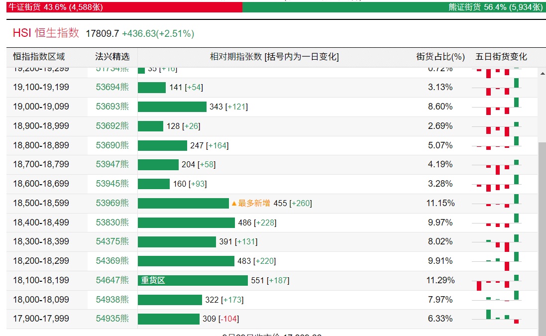 法兴恒指牛熊证街货分布图中的数据显示,熊证街货重货区在18100-18199区间,该区间最新熊证数量为551张,较上一交易日增加187张。最多新增在18500-18599区间,该区间最新熊证数量为455张,较上一交易日增加260张。